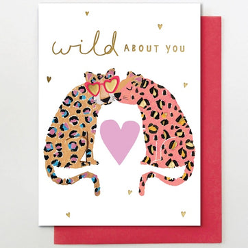 This funky Valentine's Day card reads 'wild about you' alongside a playful illustration of two leopards. Complete with gold foil details. Blank inside.