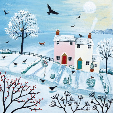 This card pack of 8 cards pictures a couple of beautiful houses surrounded by white snow and birds of nature. This is a perfect card to give to your loved ones this Christmas season!