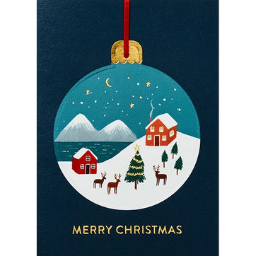 Merry Christmas. This Winter Wonderland card is also a gift as the recipient can pop out the bauble and hang it on their tree. This die cut Christmas card is blank inside, is printed on luxury card and comes with a satin ribbon and a quality envelope.