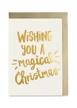 This is a fun Christmas card featuring the words 'wishing you a magical Christmas' in shiny letters. This card has been left blank inside for a personal message an comes with a bright pink envelope.