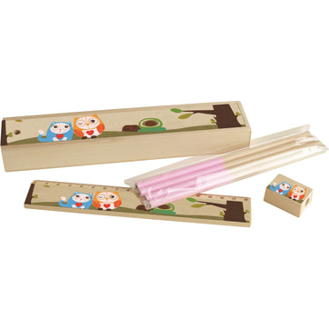 This sweet wooden pencil case with owl design is a fun retro accessory to keep your pens and pencils safe at school or at home. Comes with 4 pencils, a ruler and a pencil sharpener.