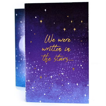 Written In The Stars. This starry fold out Valentine's card has a simple message "I love you" inside when you open it out. Finished with gold foil and printed on forest friendly card, this card is blank inside and comes with a q00% recycled envelope.