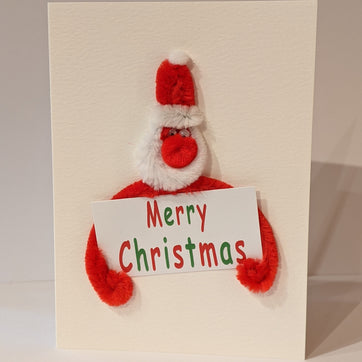 This delightful hand-made Christmas card features a cheerful pipe-cleaner Santa Claus holding a festive sign.
