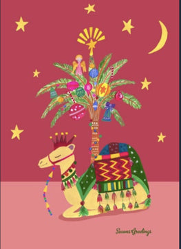 This festive camel knows how to improvise with a decorated palm tree set on top a colourful seasonal background. Paper card with cello and white envelope.