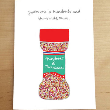 You Are One in Hundreds And Thousands, mum! This Frankie Nicholas illustrated sprinkles filled cake topping mother's day card is blank inside, is printed on forest friendly card and comes with a quality kraft envelope.
