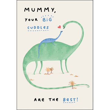 Mummy your big cuddles are the best. This pre-historic Mother's Day card has the message "Happy Mother's Day" inside, is printed on fetted board and comes with a quality envelope.