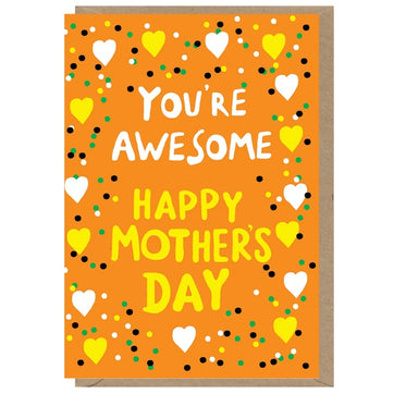 You're Awesome. Happy Mother's Day. This eye-catching card boasts a bold orange backdrop and sunny yellow text, guaranteeing to stand out and bring a smile to Mum's face. This colourful Mother's Day card is blank inside, is printed on forest friendly card with vegetable-based inks and comes with a quality brown kraft envelope.