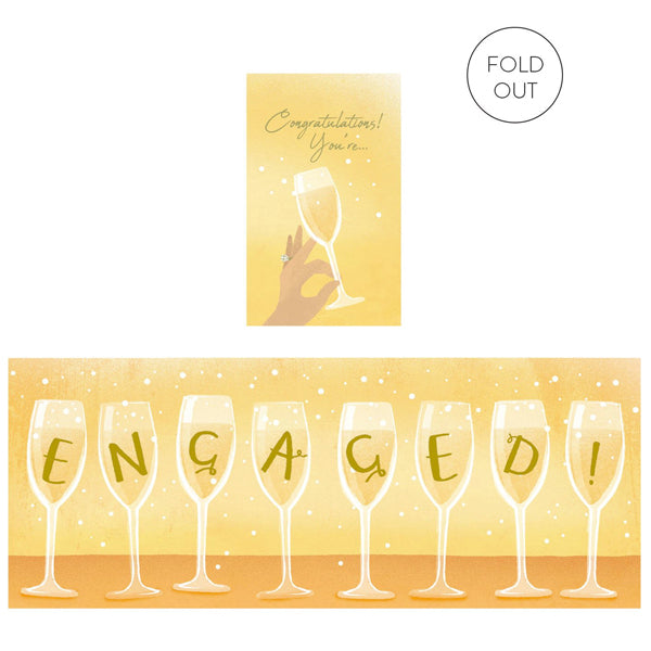 Congratulations, You're Engaged. This concertina engagement card folds out four times to reveal the word ENGAGED. This gold foil card is 100% recyclable, printed on forest friendly card with vegetable inks and comes with a recycled kraft envelope.